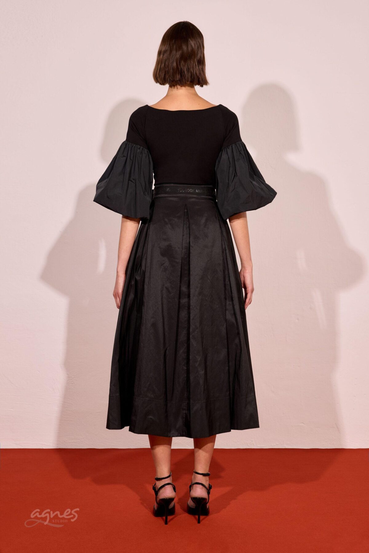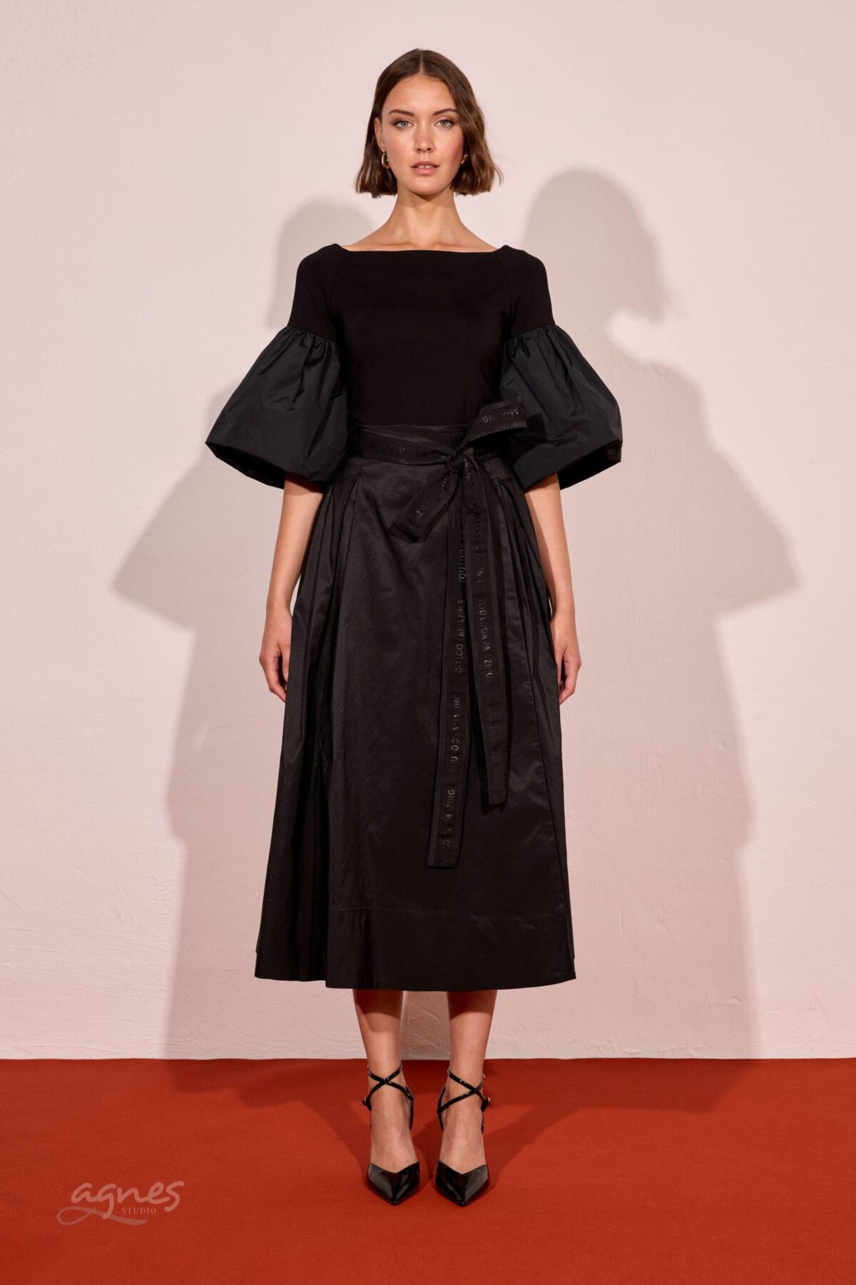 Elegantní černá sukně 3/4 délky a triko elastické s balónovými rukávy