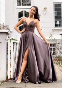 Večerní šaty na maturitní ples se saténovou sukní, na ramínka