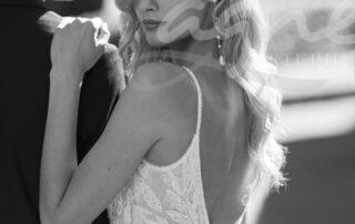S hlubokým výstřihem, odhalenými zády a sukní s bočním rozparkem.