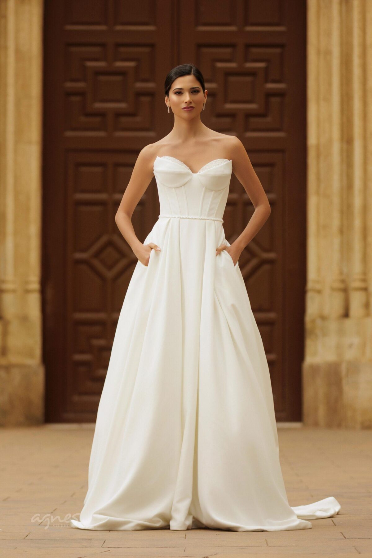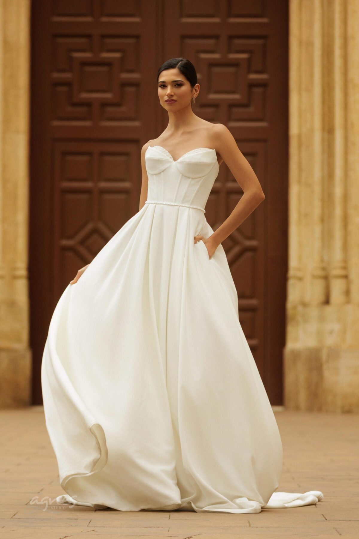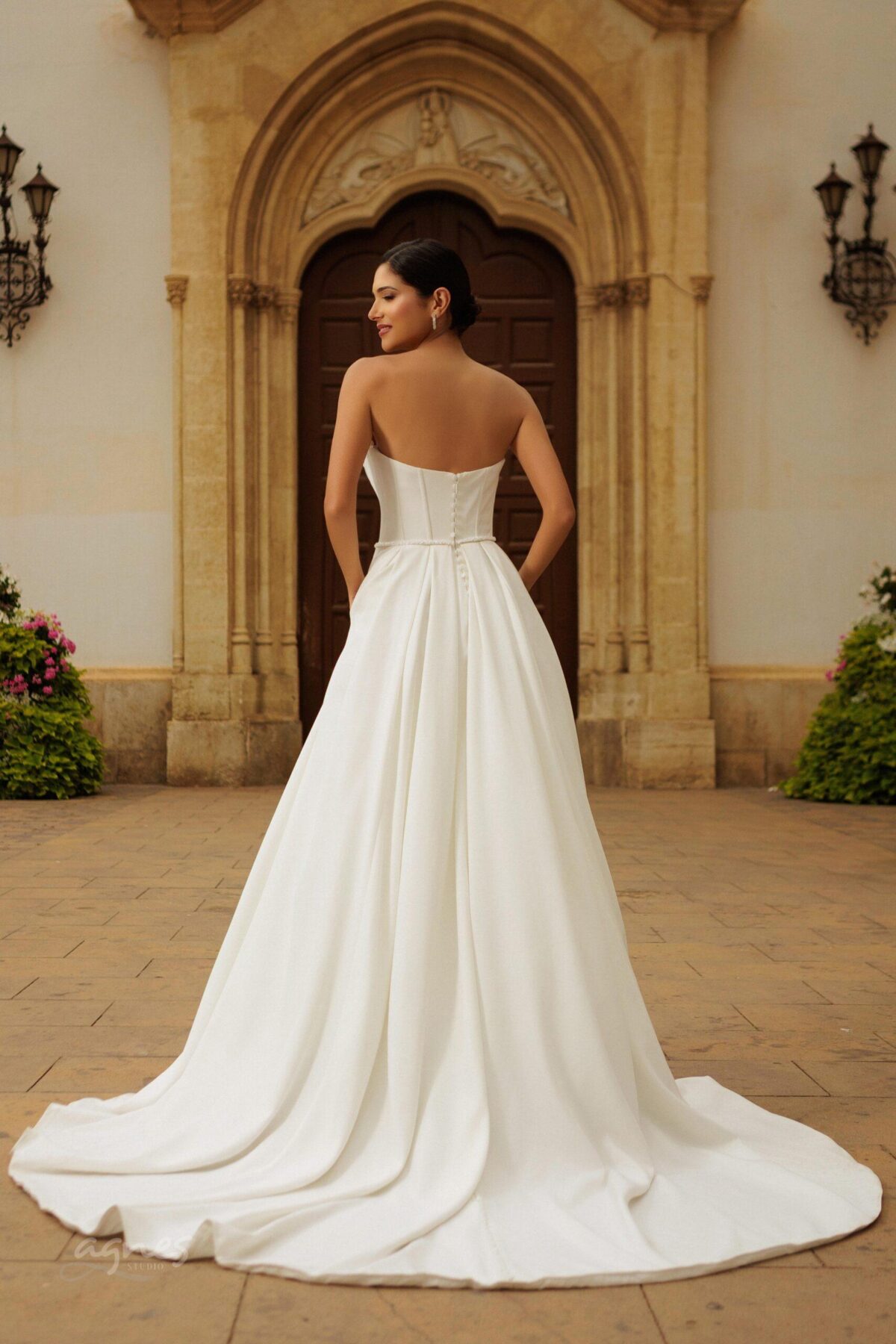 Svatební šaty TEREZA korzetového střihu, ozdobené perlami, minimalistického střihu z hladkého matertiálu, bohatá sukně s vlečkou