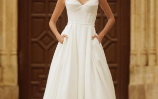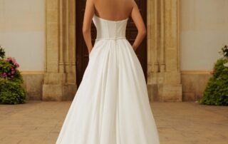 Svatební šaty TEREZA korzetového střihu, ozdobené perlami, minimalistického střihu z hladkého matertiálu, bohatá sukně s vlečkou